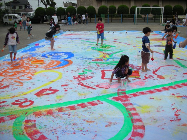 全身を使って大きな絵を描く子どもや座り込んで一心に描き続ける子ども。服が汚れるもの構わず足跡を付けながら走る子ども。様々な模様が重なり、時間の経過とともに大きな画面が色で埋められていく。