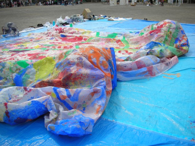 1日(5時間)で子どもが参加でき完成させ飛ばせる企画を考えた。人が行き交う場であるため、少しでも参加してくれた人の痕跡が残せ、最後にそれを違った視点で見ることを試みる。6m×17mの大きな長方形の紙と絵具を用意し、子どもたちはその紙の上に乗って自由に絵を描いていく。