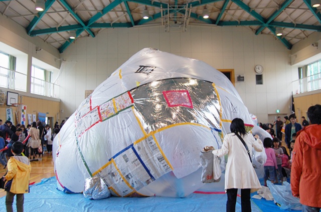 家にある様々なビニールや紙をセロハンテープやガムテープで貼り合わせる。大きな1枚になり送風機で空気を入れて膨らまし、子どもたちがその中に入る。