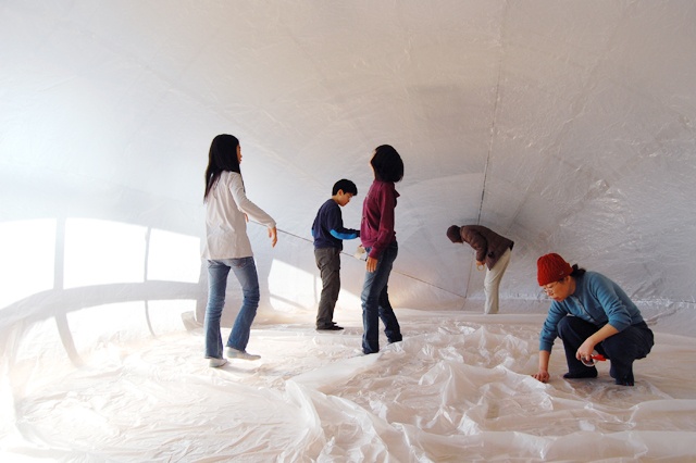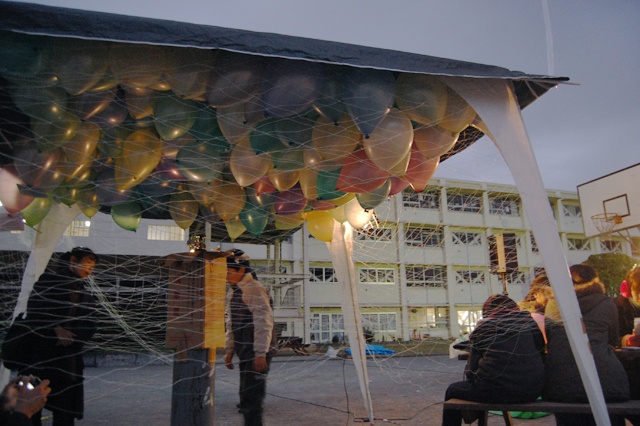 来場した人は小さな紙に言えなかった言葉や想いを書き、ヘリウムの入った風船に記入した紙を付ける。中学生と制作した紙気球を膨らまし立ち上げ、参加者は自らその風船を気球の中に入れていく。
