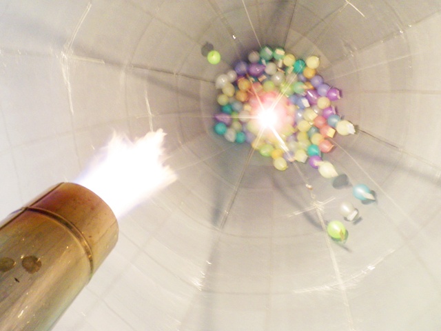 それぞれの思い出が書かれた風船が詰められた気球は飛んでいき、参加者が気球のロープを引っ張る。気球が破け、内部にあった風船が上空で放たれる。
