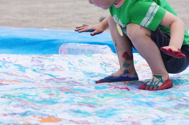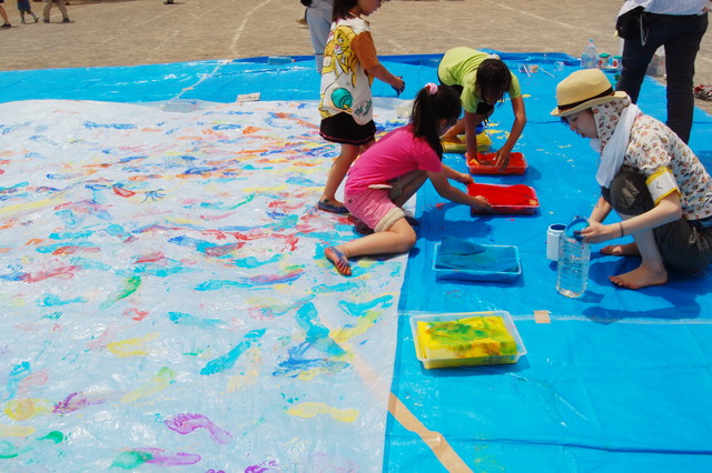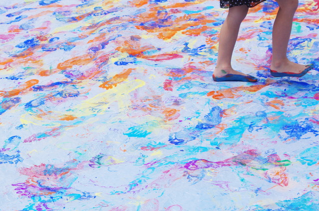 7m×7mの正方形の紙を2枚用意し、その紙の一辺に絵具を入れたいくつかのトレイを並べた。参加する子どもたちは足に絵具を付け、紙の上を歩き回る。紙には数々の色の足跡が付けられ、子どもが歩くにつれて痕跡は薄れていく。