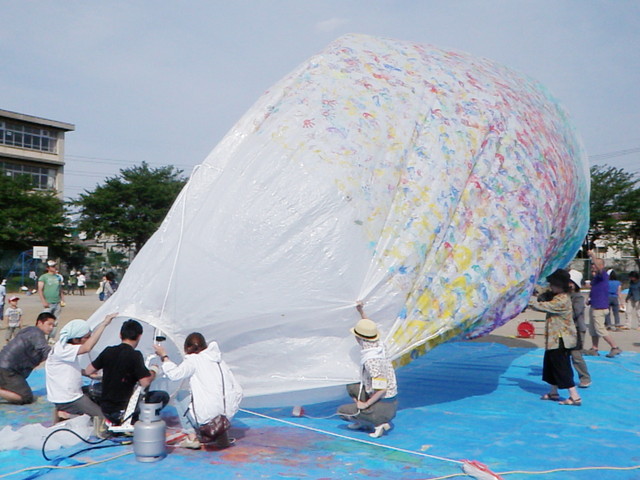 子どもたちの歩みの軌跡でいっぱいになった紙を、円柱形になるように貼り合わせた。熱気を入れ、子どもたちの足跡が空を歩くように回転させながら浮遊した。