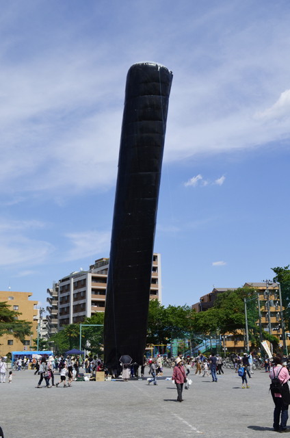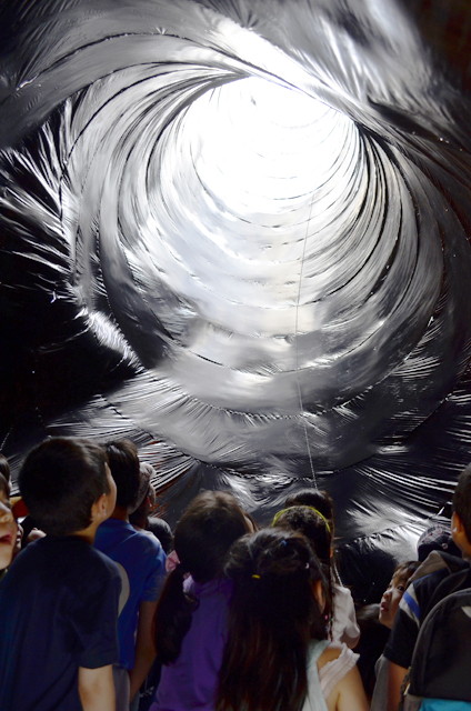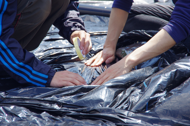 上面が透明、側面が黒の円柱形を制作。日光で内部の気温が上がると塔のように立ち上がっていく。1日を通して側面は継ぎ足され続け、時間とともに巨大化する。風でなびく塔の中に入って見上げると、塔がまっすぐになったときにだけ小さな円形の青空が見える。