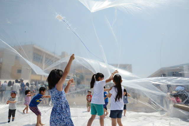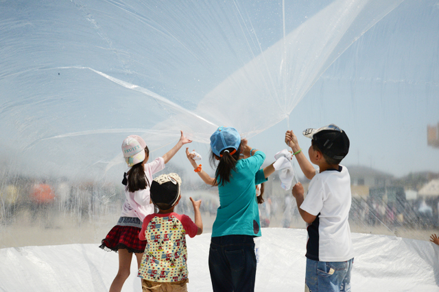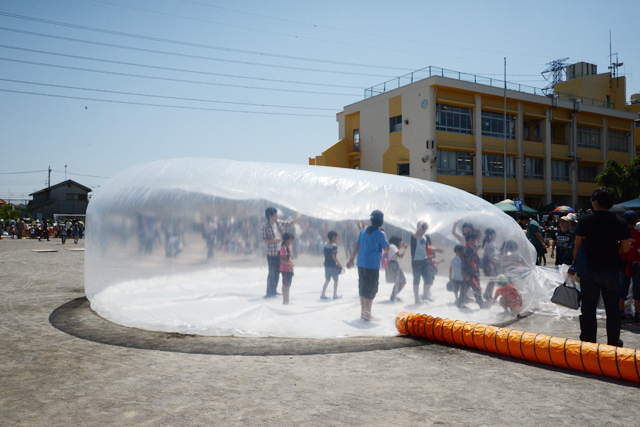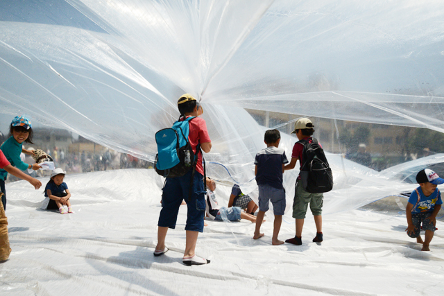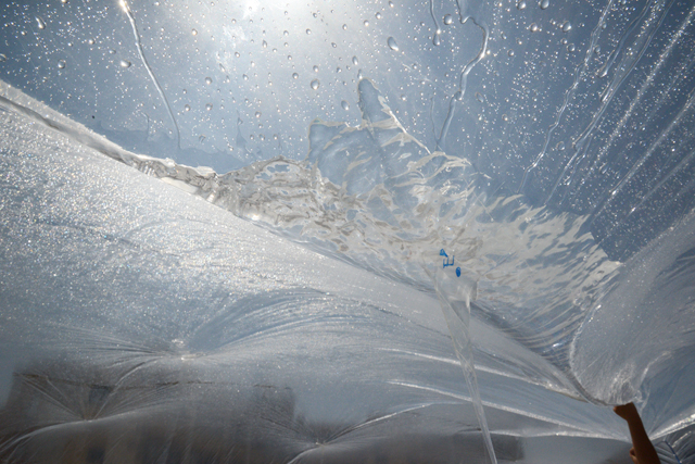 円柱形のドームをつくり、内部には上面と底面をつないだロープが無数にある。上面からはスプリンクラーで水が撒かれ、中に入った子どもたちは、内部のロープを引くことで上部に溜まった水を集める。